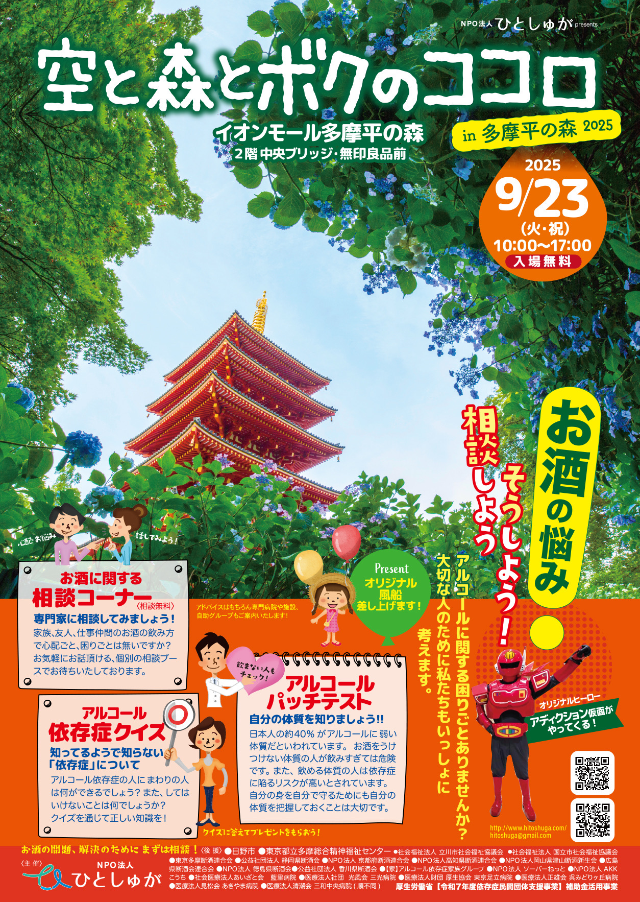 2025年9月23(火祝)10:00~17:00 イオンモール多摩平の森(東京都日野市)にて、各地から総勢44 名の運営スタッフが集まり、依存症啓発イベント「空と森とボクのココロ in 多摩平の森」が開催されました![]()