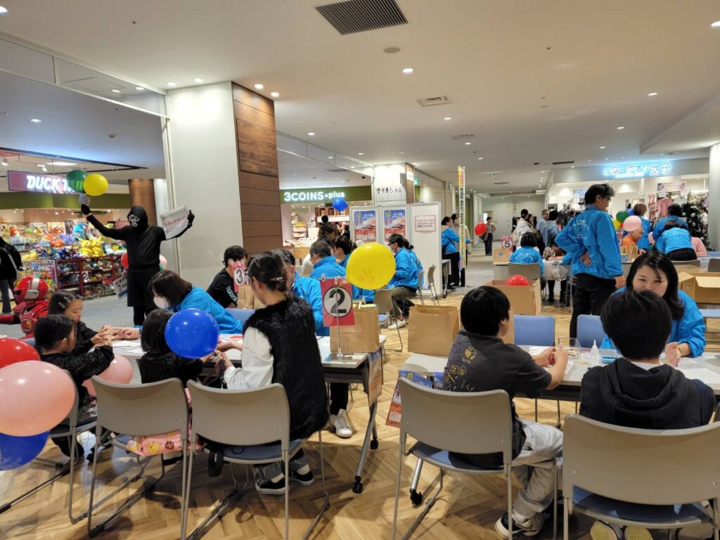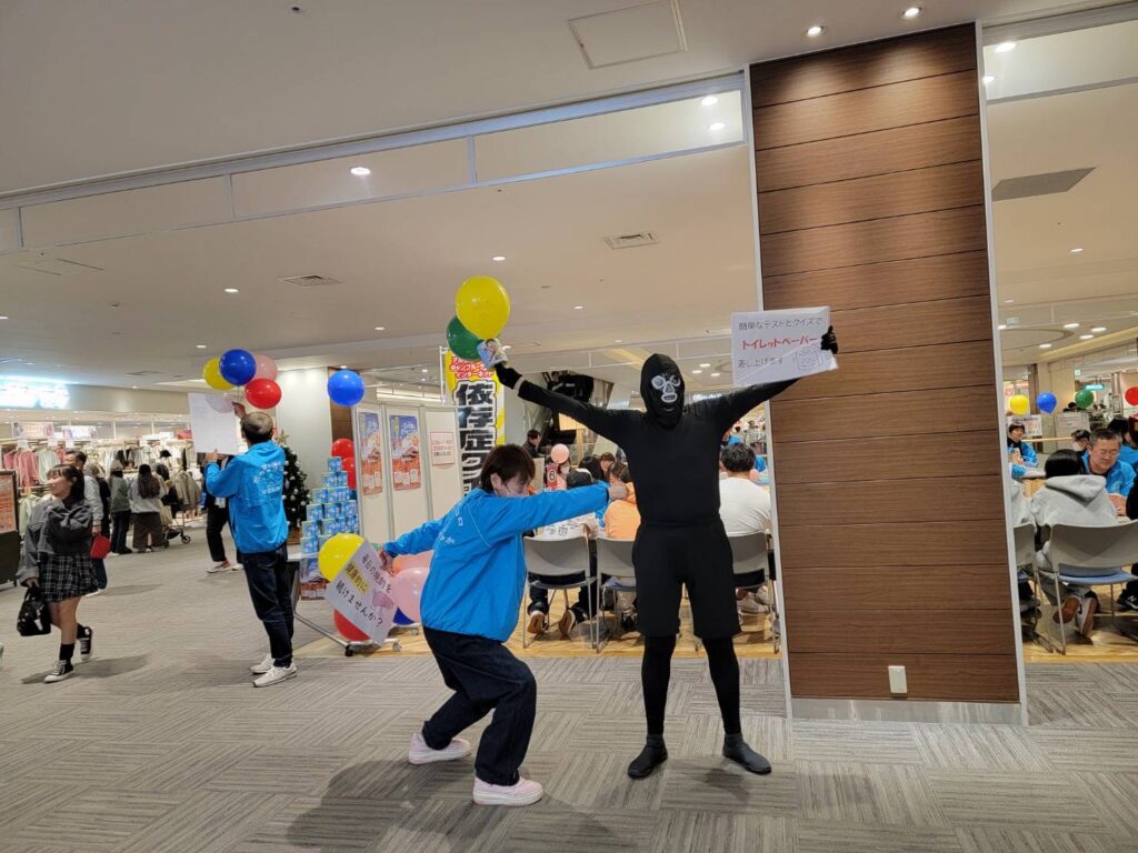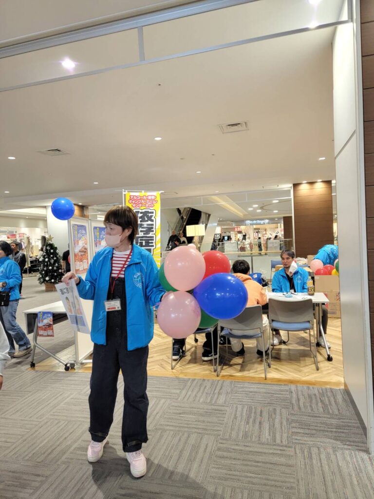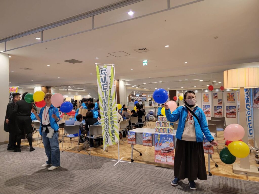めちゃくちゃきれいにノベルティでタワーを作り、風船も飾り付けてディスプレイも完成です。